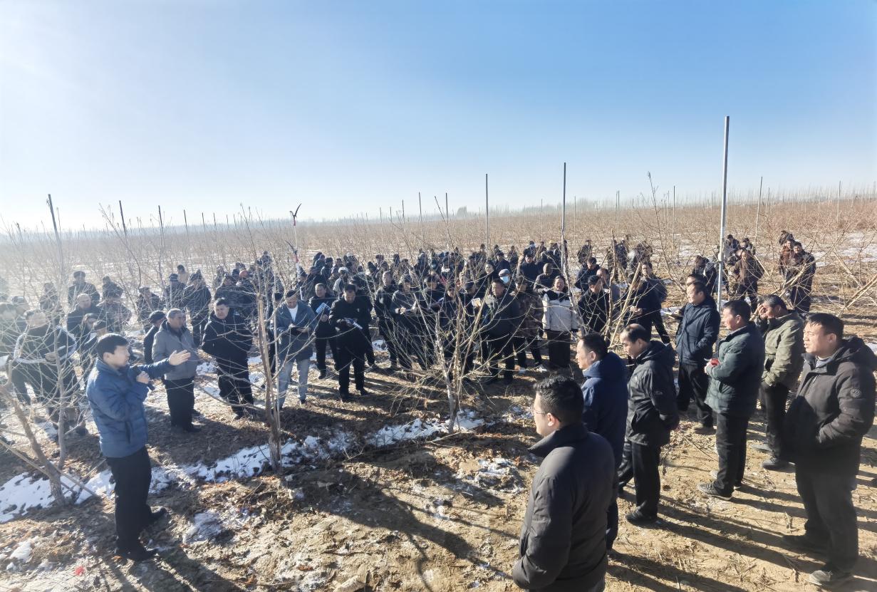 在果园现场,王新卫研究员先向与会人员介绍特色林果产业发展、树种结构调整、桃树栽培树形、Y形树形标准化生产园建立和品牌打造等方面知识,接着一边讲解修剪要点,一边进行示范修剪。围绕丰产树形建立,进行主枝延长头选留、背上背下枝疏除、侧枝与牵制枝培养、枝组更新等内容讲解与示范。在培训中,王新卫希望各地在建立林果基地时,贯彻现代果园发展理念,以采用一流的品种和一流的技术,实施一流的管理,生产一流品质的果品,打造一流的品牌,实现一流的效益为目标,实现特色林果产业的标准化高质量发展。本次培训用通俗语言讲解技术知识,解决了部分果农冬季修剪中遇到的疑难问题。示范基地技术员一同参与示范修剪和技术交流。