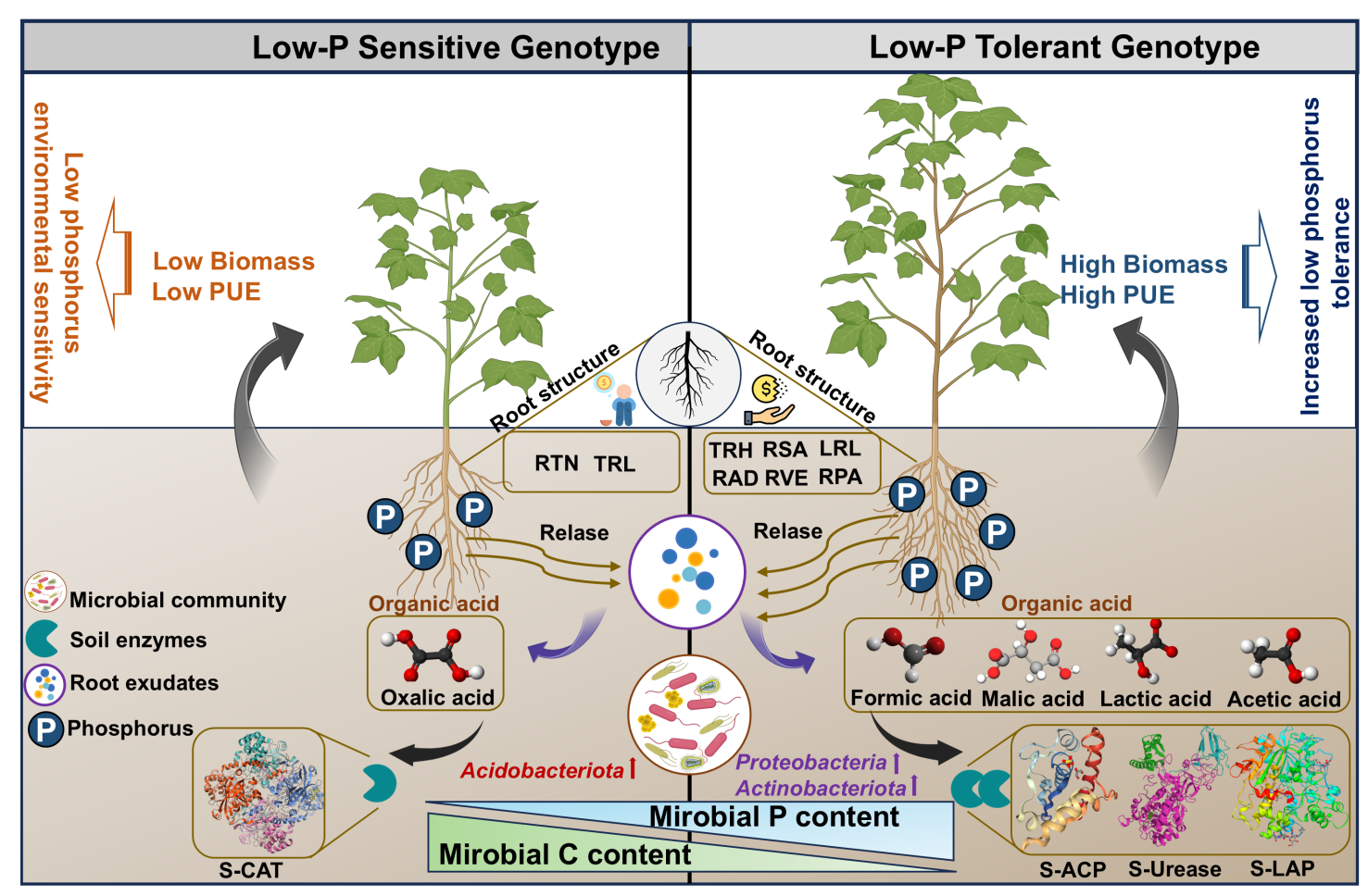 研究团队通过盆栽试验系统比较了不同耐低磷棉花基因型在低磷条件下的适应性差异,综合解析了根系构型及其可塑性、根际有机物分泌特征、微生物介导的土壤碳氮相关酶活性变化以及优势根际微生物群落的招募特征。研究结果表明,耐低磷基因型能够通过重塑根系构型,增强根系对土壤空间的利用效率,并主动分泌苹果酸、柠檬酸等有机酸,显著富集变形菌门、放线菌门等有益根际微生物类群;上述过程进一步协同提升土壤酸性磷酸酶等关键酶活性,有效促进土壤中难溶性磷的活化与释放,最终显著提高棉花对磷素的吸收与利用效率。该研究深化了对棉花磷素高效利用途径的理解,为通过遗传改良或根际微生物调控途径实现棉花绿色高效施肥提供了重要的理论支撑。