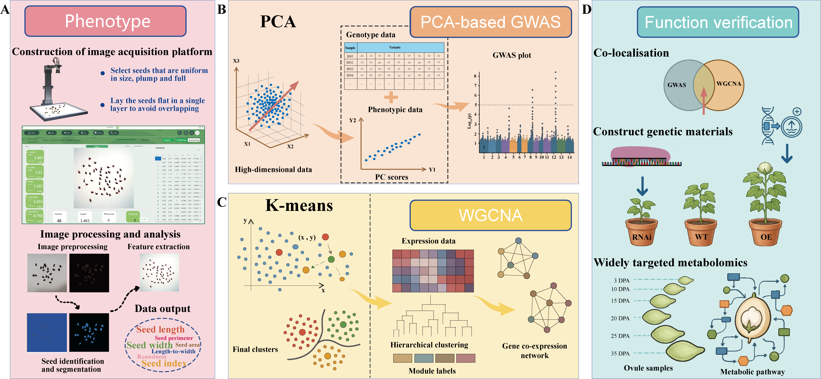 研究团队通过自主构建的高通量智能种子表型分析平台,对419份棉花自然群体材料进行精准表型测定,获取种子长度、宽度、面积等多维表型数据;通过基因型结合表型数据进行全基因组关联分析(GWAS),定位到显著区间;利用转录组共表达网络分析(WGCNA),鉴定到与种子大小相关的Hub核心基因集;二者共定位分析,成功锁定到关键调控基因GhCSS10,并通过转基因功能验证证实其在棉花种子大小调控中的正向作用。进一步的代谢组分析表明,GhCSS10通过调控种子发育过程中不同阶段的代谢调控变化发挥作用:在早期促进能量代谢和细胞扩展,在后期促进碳水化合物积累和籽粒充实,从而协同决定种子大小。该研究不仅为棉花种子性状分子育种提供了新的关键基因资源和理论依据,也为多组学技术解析复杂农艺性状提供了重要参考,对推动棉花高产优质育种具有重要意义。