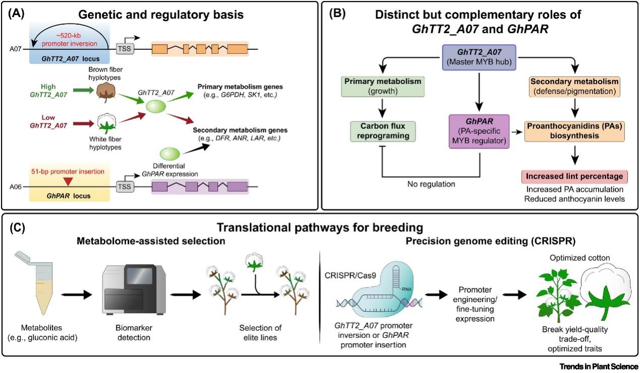 研究发现GhTT2_A07与GhPAR两个MYB转录因子构成代谢调控核心枢纽,其中GhTT2_A07通过520kb大片段倒位的顺式调控,主导初生代谢(有机酸、糖类)与次生代谢(黄酮、原花青素)的碳流分配。高表达会促进黄酮积累、提升纤维抗逆性与色泽形成,但分流碳源抑制纤维伸长;GhPAR则通过亚功能化精细调控原花青素合成,协同平衡纤维产量与适应性性状。这一机制从代谢层面,首次系统解释了棉花生长-防御权衡、纤维色泽与产量负相关的经典育种难题。