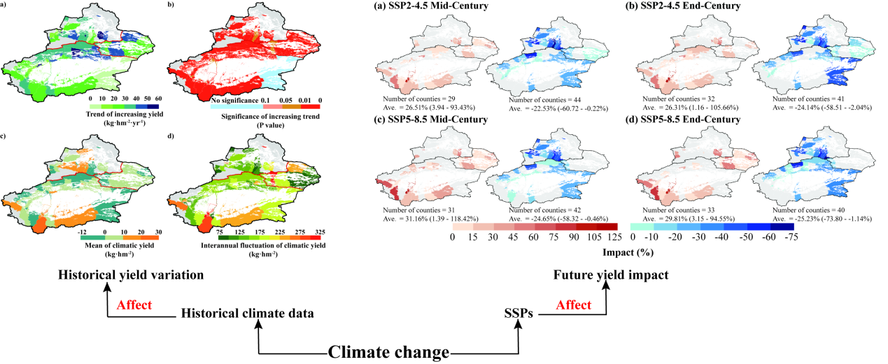该研究利用1990~2024年新疆73个植棉县的产量数据与气象数据,构建了随机森林等机器学习模型与面板回归模型相结合的分析框架,分离气候与非气候(技术、管理等)因素对产量变化的贡献。结果表明,气候波动平均解释了约三分之一的棉花年际产量变异,而长期产量增长则主要由技术进步和农艺改良驱动。技术因素年均提升产量约30 kg·ha⁻¹。空间上,约34%的植棉县受到气候不利影响,主要分布在北疆及高海拔区域;而南疆和东疆部分区域在当前气候变暖条件下表现出一定增产趋势。随机森林模型中的变量重要性分析显示,海拔、最高温度、有效积温和太阳辐射是影响产量波动的关键因子。研究预测,在未来气候变化情境下,全区平均产量总体仍呈增加趋势,但县域间差异将进一步扩大。预计到本世纪中叶,在受不利气候影响的县域,累计产量损失可达24万~32万吨/年。研究提出,新疆棉花生产系统呈现出“技术主导长期增长、气候主导年际波动”的双重驱动特征。未来应加强区域差异化适应策略,在北疆等气候敏感区域强化抗逆品种选育与水资源优化管理,同时在具备气候优势的区域推进生产布局优化,以提升整体气候韧性。研究结果为解析棉花产量变化提供了清晰的归因框架,明确了气候与非气候因素对产量的影响机制,并为新疆棉区制定差异化区域适应策略提供了重要科学支撑,对未来气候变化、稳定新疆棉花生产、保障产业安全、推动农业高质量可持续发展具有重要意义。