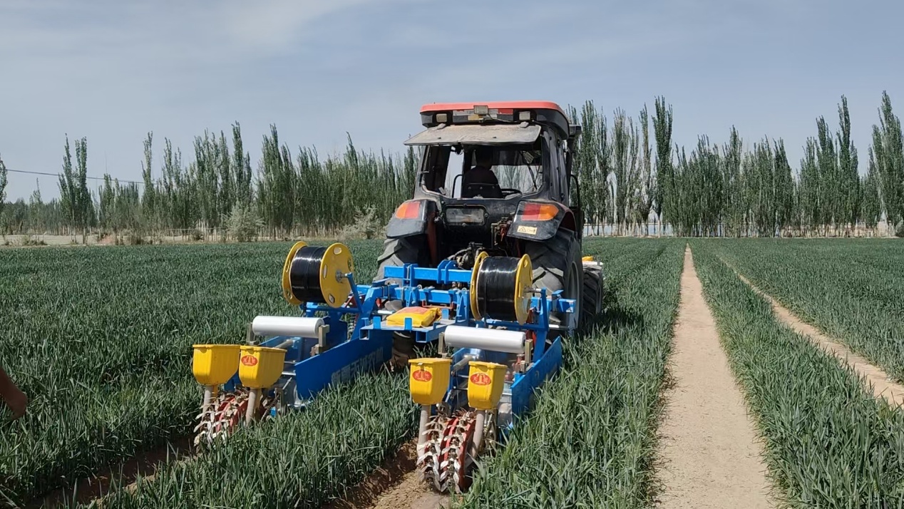 春风送暖,万物复苏。4月26日,喀什地区疏勒县巴合齐乡一块180亩农田小麦长势茁壮、青绿盎然,种植农户抢抓春日有利农时,在麦田预留棉行间有序播种棉花。