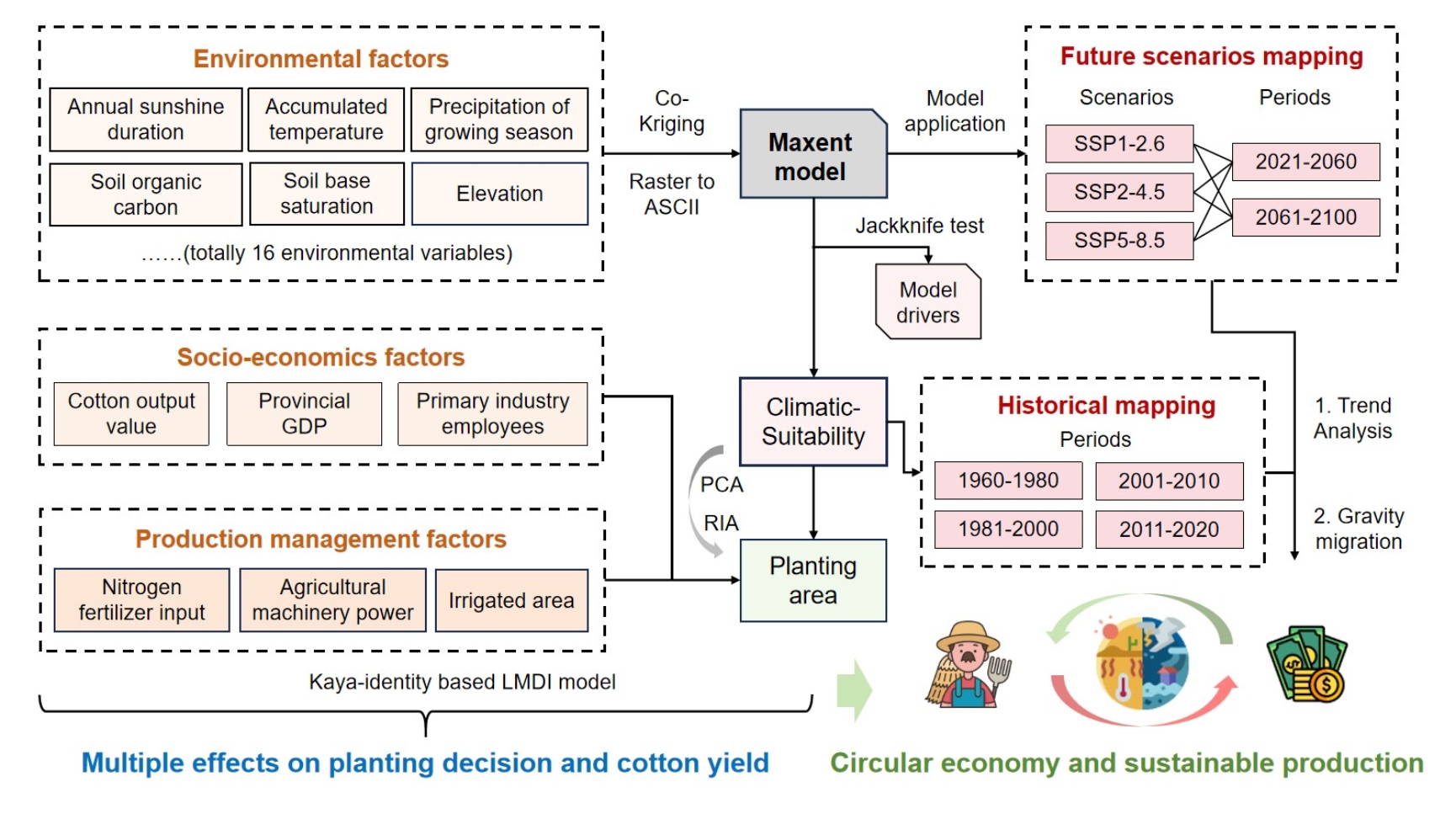 在全球人口持续增长与气候变化加剧的双重背景下,耕地适宜性格局正在发生深刻变化,农业生产面临需求增加与资源约束的严峻挑战。棉花是我国重要经济作物,全球变化已推动棉花种植区迁移并影响稳产增产。尽管栽培耕作技术的进步在一定程度上缓解了气候冲击,但棉花种植适宜性在长期气候情景的变化仍存在不确定性,且实际种植格局受气候、生产与社会经济因素共同驱动,亟需多维度、长时间尺度的系统评估,以优化未来气候情景下棉花的种植布局。