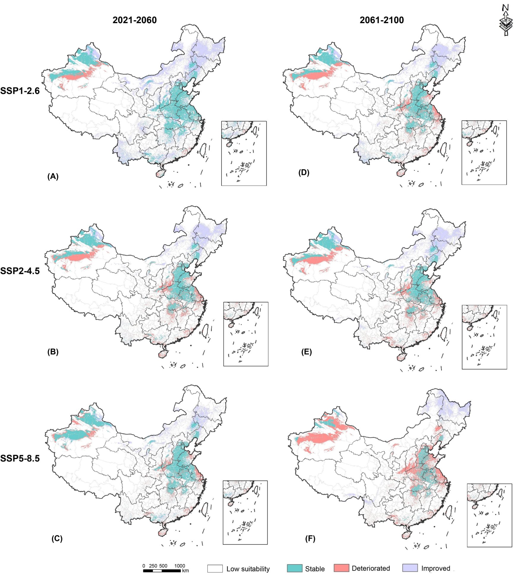 我国棉花适宜种植区域在三种未来气候情景下相对历史时期的变化趋势