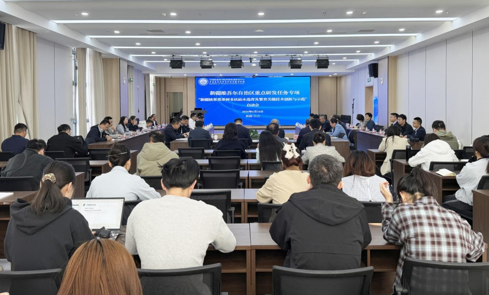 2026年4月16日,新疆维吾尔自治区重点研发任务专项“新疆核果类果树多抗砧木选育及繁殖关键技术创新与示范”启动会在昌吉召开。中国工程院院士刘旭出席,中国农业科学院西部农业研究中心(科技援疆指挥部)主任、党委书记(总指挥)高雷主持会议。