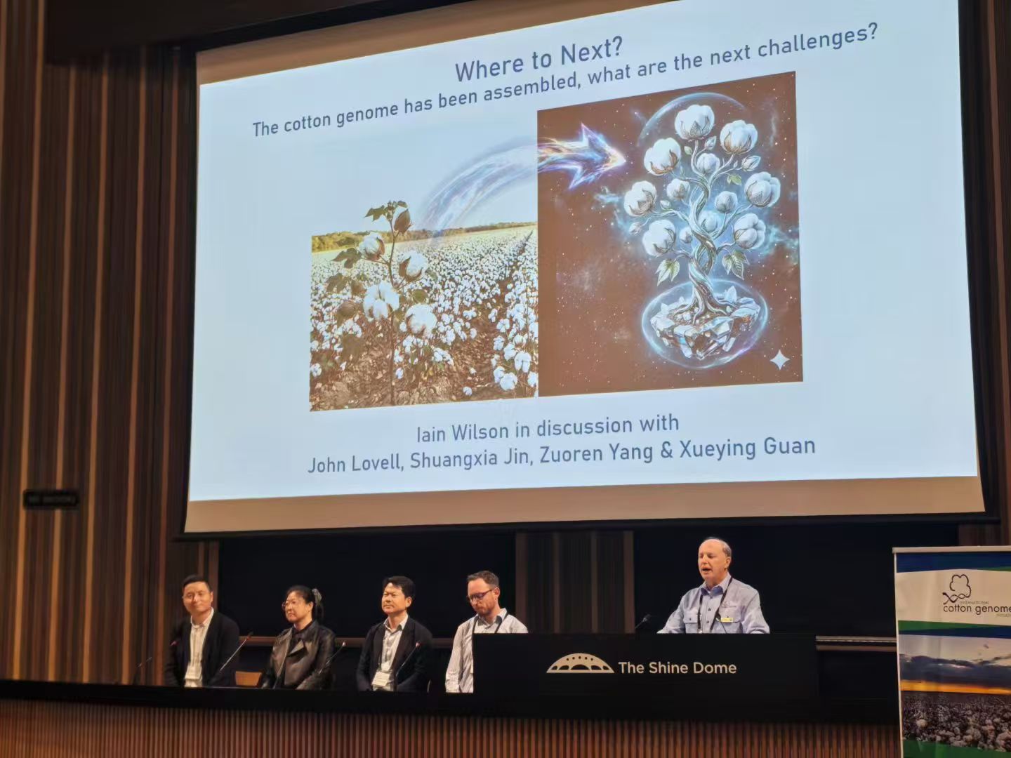 本届大会聚焦基因组育种、功能基因组、生物信息等前沿方向,汇聚来自中、美、澳、巴等国家的顶尖科学家。杨作仁研究员围绕棉花基因编辑技术应用、纤维品质遗传调控等议题,与Iain Wilson、John Lovell等国际权威专家深入交流。杨作仁研究员作了题为"The molecular mechanisms of cotton fiber development"的特邀报告,系统阐述了西部中心棉花研究团队在棉花纤维发育分子机制领域的最新成果,分享了西部中心整合分子生物学、遗传学、表型组学等技术的特色研究体系,并作为讨论嘉宾参加了棉花基因组的下一步挑战专题讨论。